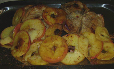 - Using a spatula, carefully place the apple rings on top of the pork chops. Simmer together for 5 minutes.